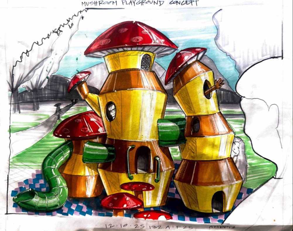 This was a project from my perspective rendering class last semester, one of my first times sketching and rendering the industrial design way. The assignment was simple: design a playground. My mind went straight to something whimsical and immersive, and the mushroom world concept came to life from there.