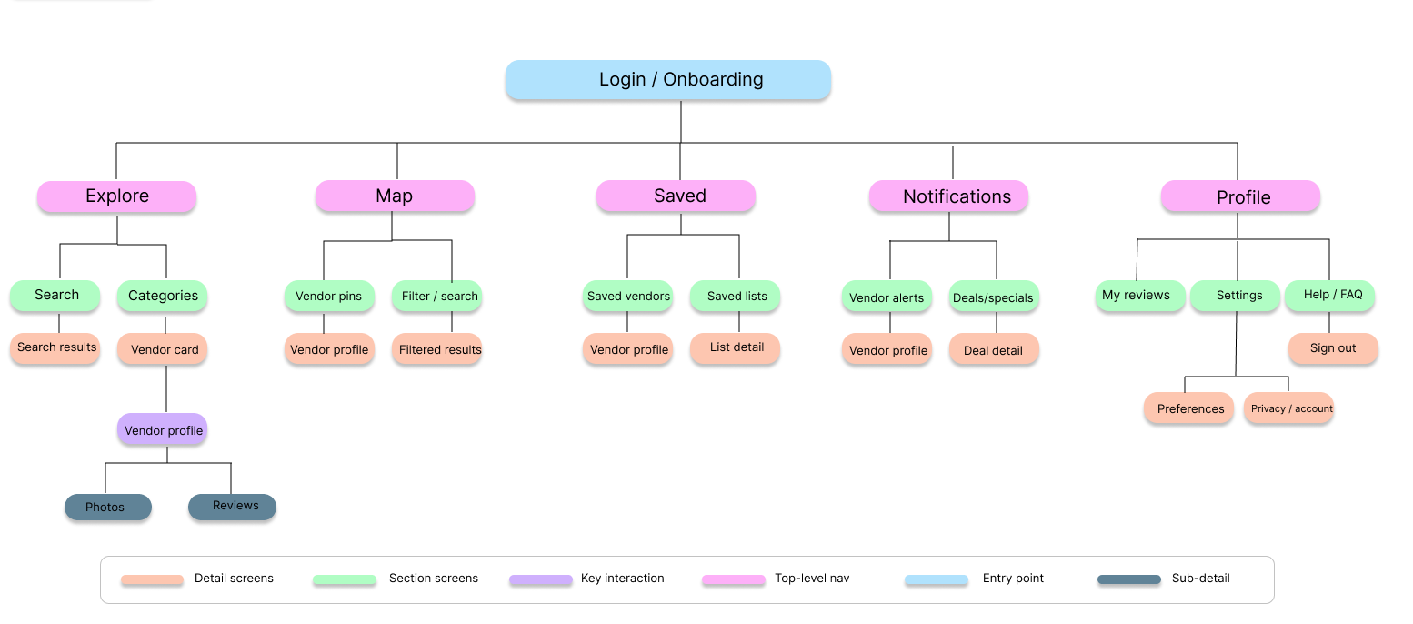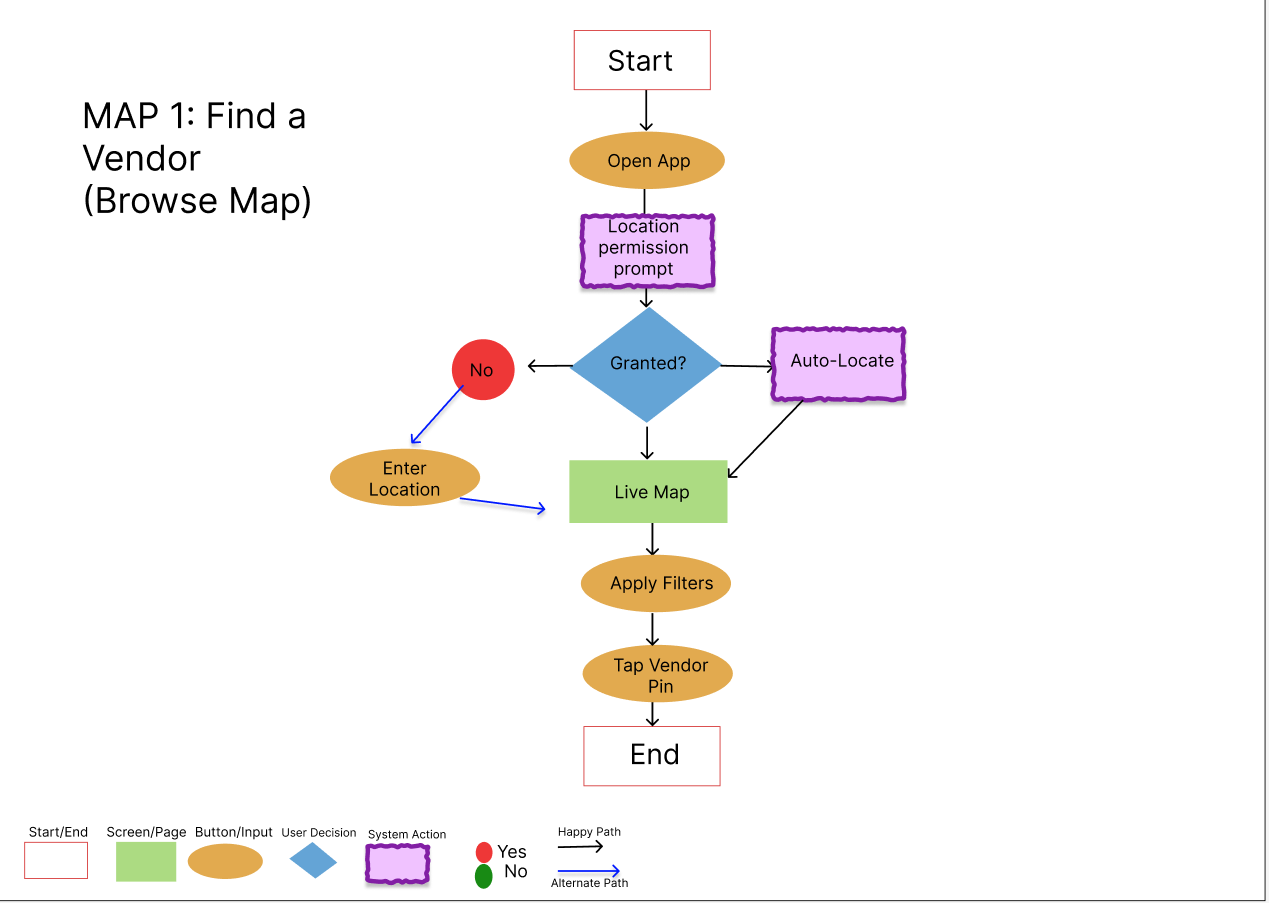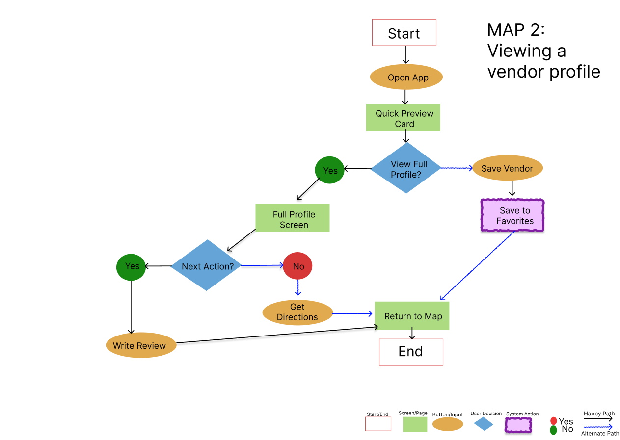 Two primary user flows were created to guide the design process and support future usability testing. The first outlines a simple onboarding experience that introduces users to the app and its key features. The second maps the different paths users can take to discover nearby street food vendors, view details, and decide on a vendor within a limited amount of time.