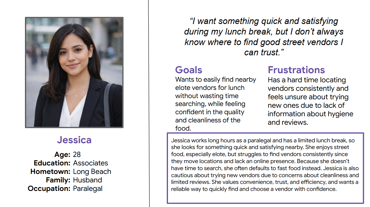 Two user personas were developed; however, the focus is narrowed to one primary persona: Jessica, a time-constrained professional who values convenience, trust, and efficiency when discovering nearby street vendors during her lunch break.