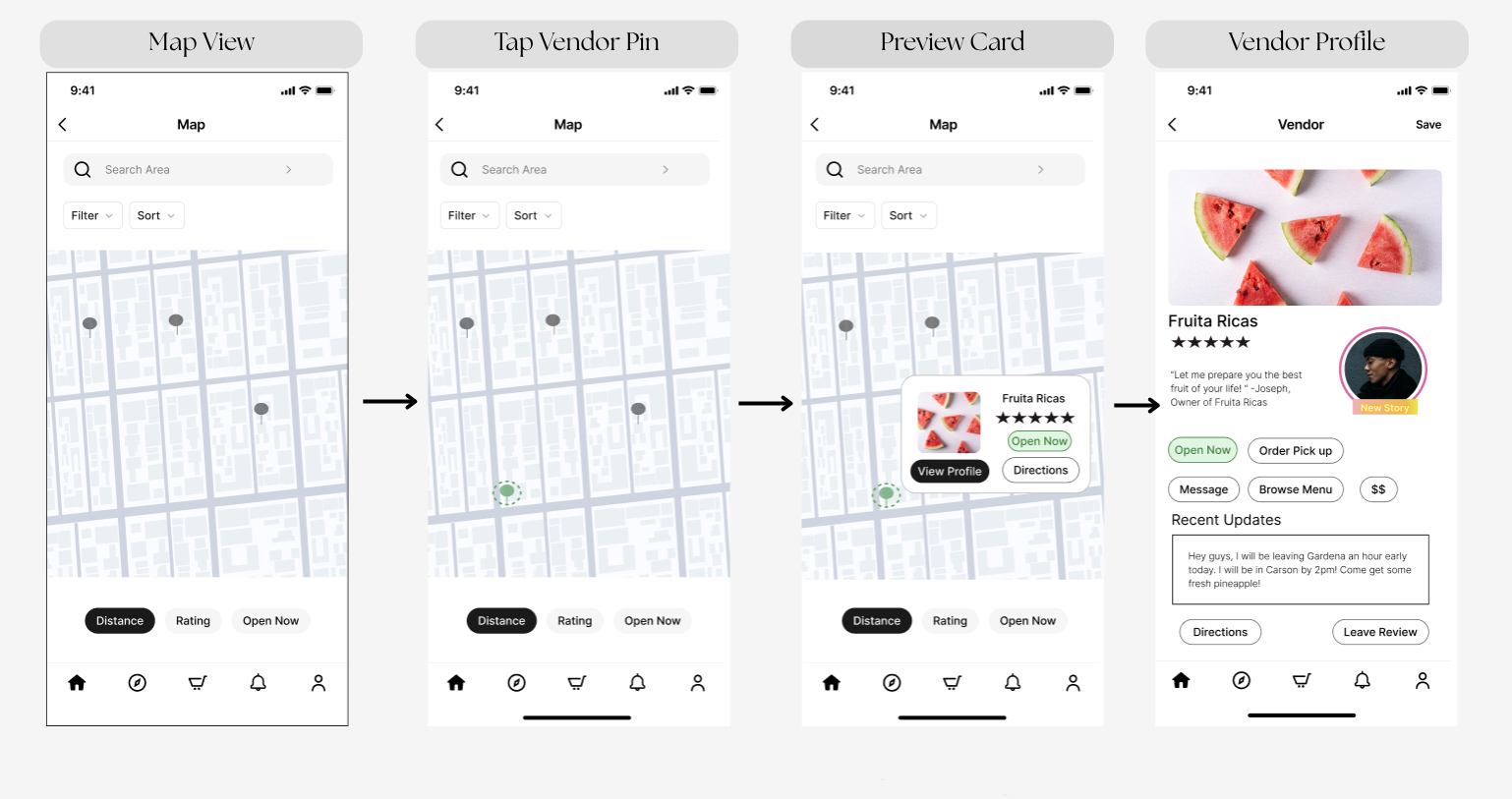 This interactive prototype showcases the core user flow, from discovering nearby street vendors to viewing vendor details.