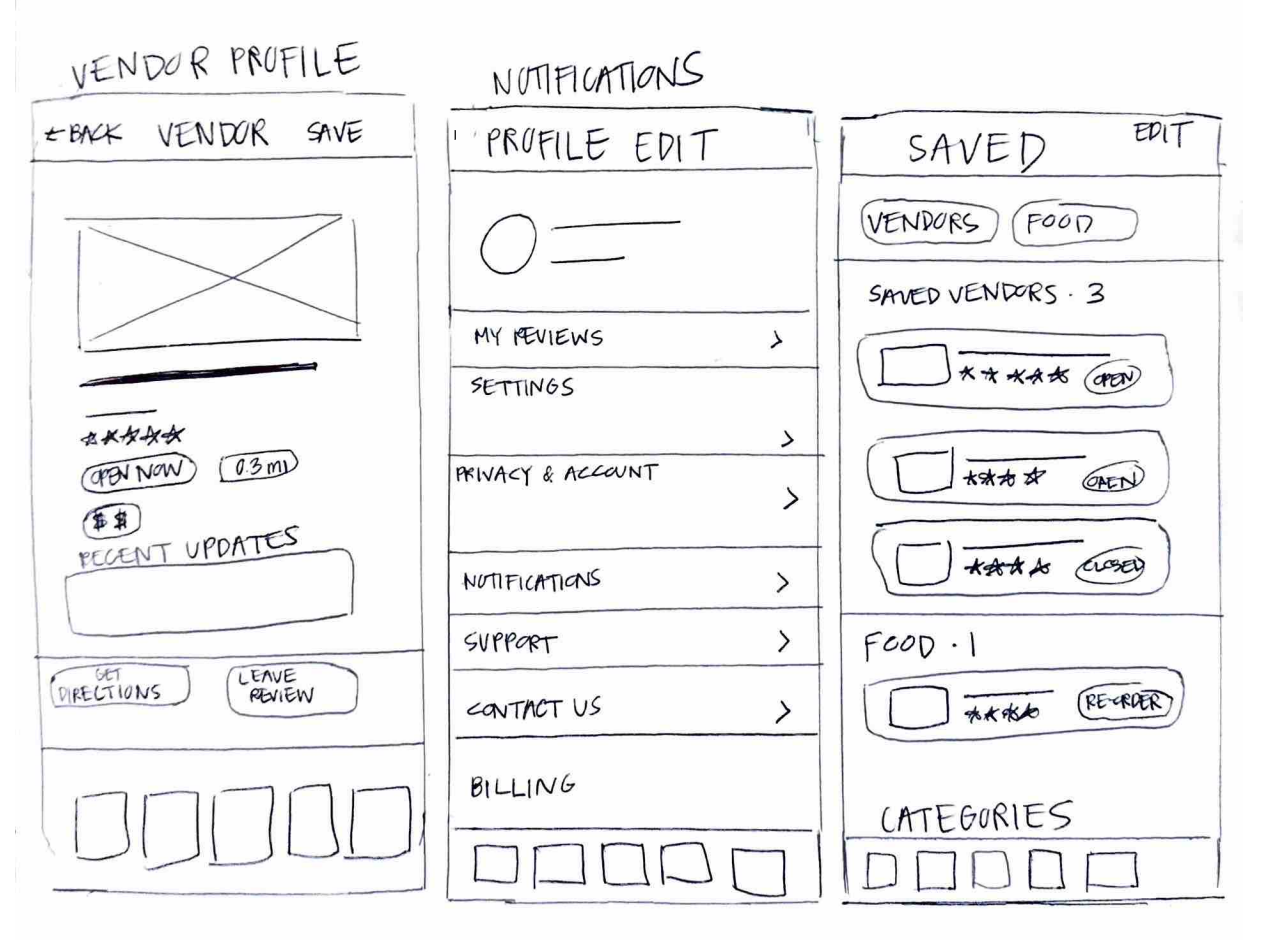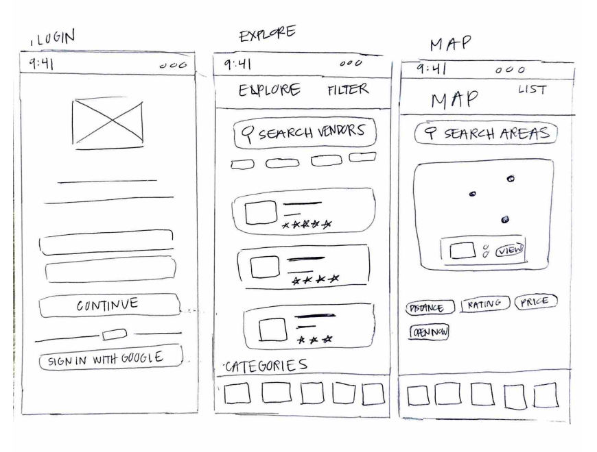 I sketched some low-fidelity wireframing to explore the basic layout, screen flow, and key features. This helped me quickly test out ideas for vendor search, map browsing, and overall navigation.