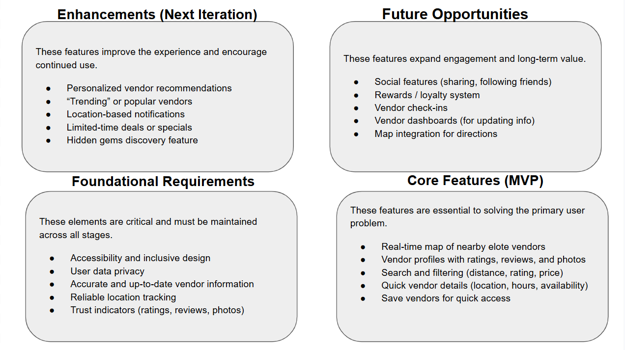 Additional features that were not included in the MVP but are important for future iterations include rewards or loyalty systems to encourage exploration, as well as social features that allow users to share recommendations or discover vendors through friends.