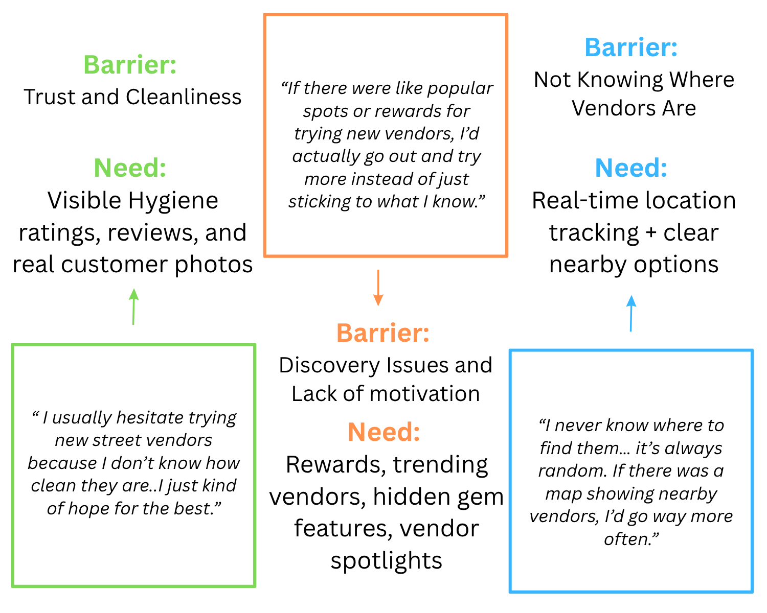 Understand the frustrations users experience, such as not knowing where vendors are located or whether the food is worth trying.Understand what motivates users to explore:
